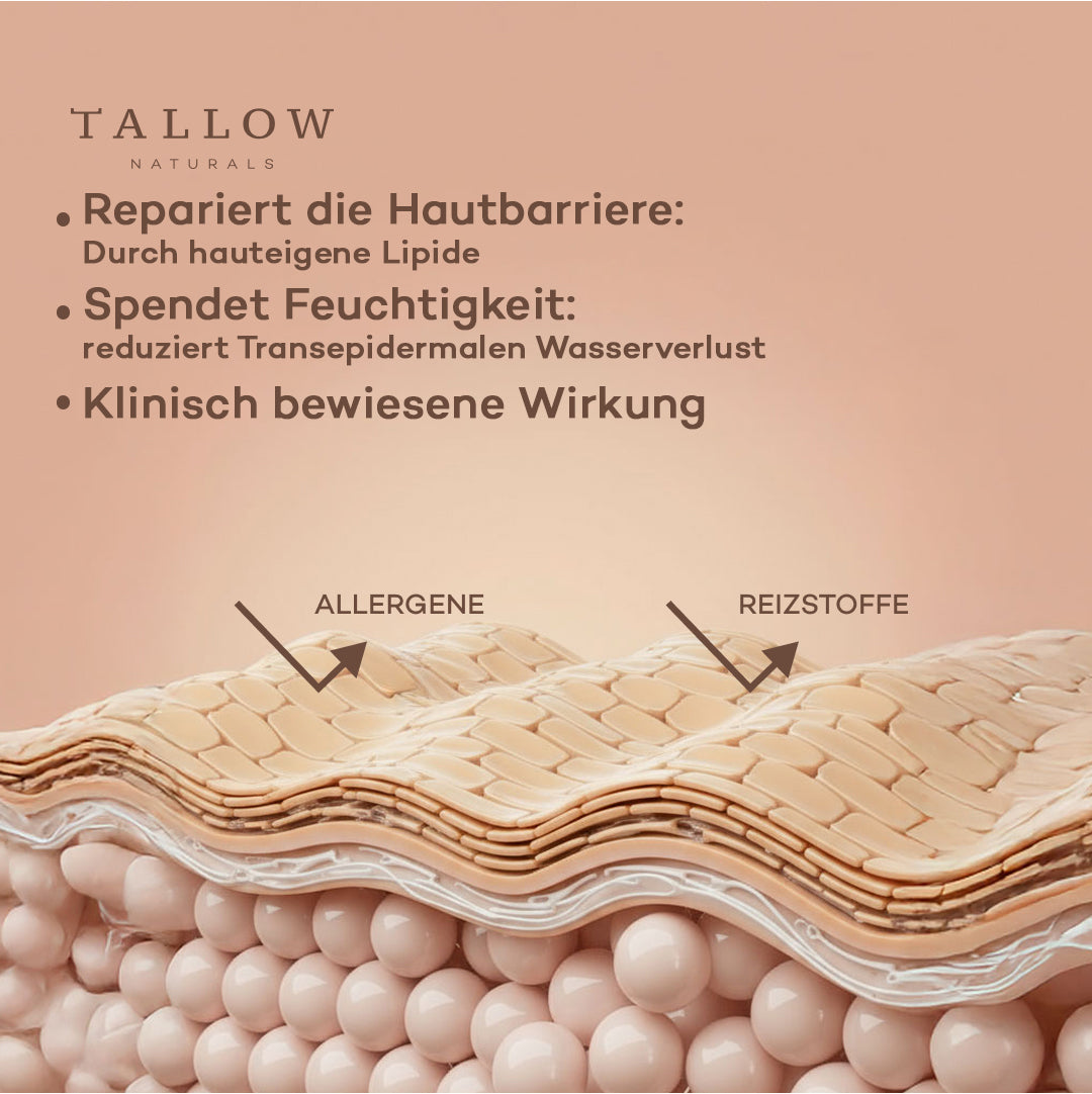Während viele Cremes nur oberflächlich wirken, nährt Tallow Naturals die Haut tiefenwirksam und hält Feuchtigkeit dort, wo sie hingehört. Die natürlichen Fette bilden einen feinen, atmungsaktiven Schutzfilm, der Wasserverlust verhindert – ganz ohne zu fetten oder die Poren zu verstopfen. Das Ergebnis: ein gepflegtes, geschmeidiges Hautgefühl, das den ganzen Tag anhält.